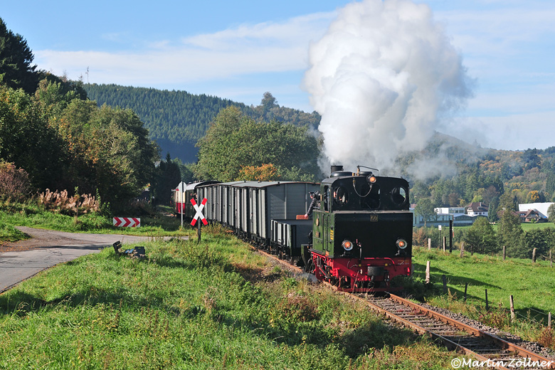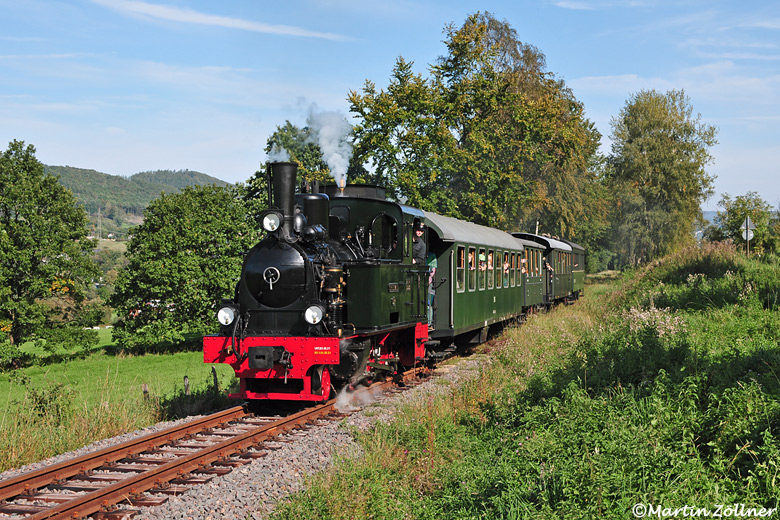 In der Fahrtsaison 2023 hat sich die Märkische Museums-Eisenbahn aufgrund der eigenen in Hauptuntersuchung befindlichen Lok "Bieberlies" eine Ersatzdampflok besorgt: Lok "Spreewald" vom DEV aus Bruchhausen-Vilsen kommt am 01. Oktober 2023 mit dem Zug 6 die Steigung nach Hüinghausen hochgeschnauft.