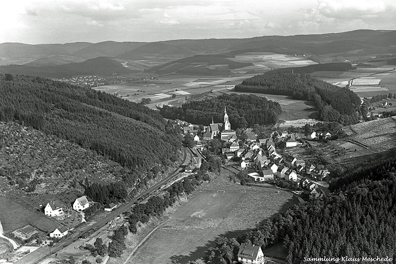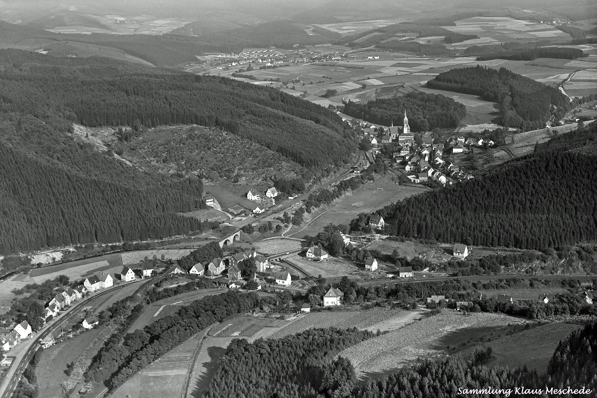 Km 2,3 Kirchhundem-FlapeAuf diesem Luftbild aus dem Jahr 1957 sieht man sehr gut den Verlauf der Bahntrassen im Bereich Kirchhundem. Während die Ruhr-Sieg-Strecke nach rechts aus dem Bild geht, verläuft die Trasse der Strecke 2863 mittig. Zuerst wird die Bundesstrasse 517 auf einer Brücke überquert, es folgt der 65 Meter lange Heitmickeviadukt und gleich anschließend die Gleisanlagen des Bahnhofs Flape. Rechts neben dem Empfangsgebäude die katholische Pfarrkirche St. Peter und Paul.