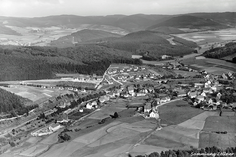 Km 2,820 Bahnhof Kirchhundem-Flape [EKHP]Ein weiteres Luftbild von 1957 zeigt den Ort Kirchhundem Flape von nahem. Hier ist die Infrastruktur mit einigen abgestellten Güterwagen gut zu erkennen. Aufnahme aus der Sammlung von Klaus Meschede.