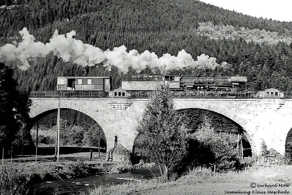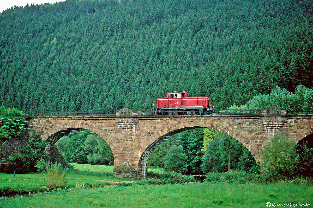 Km 2,4 HeitmickeviaduktIn Kilometer 2,4 erreicht die Strecke mit dem Heitmickeviadukt den ersten, größeren Kunstbau. Die dreibögige Brücke ist komplett mit Natursteinen verkleidet. Hiervon können wir drei Bilder mit Zugverkehr zeigen: Links hat Gerhard Moll eine in Richtung Würdinghausen fahrende Übergabe mit der BR 50 und einem Güterzugbegleitwagen aufgenommen und rechts kehrt 261 734 im Oktober 1979 leer nach Altenhundem zurück (Bild: Klaus Meschede):