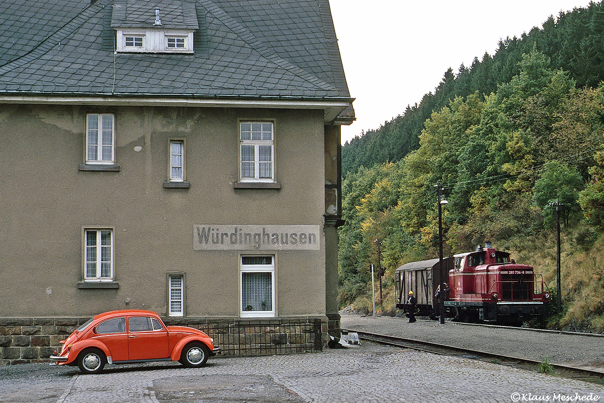 Sporadischen Güterverkehr gab es Ende der siebziger Jahre noch bis zum Bahnhof Würdinghausen. Im Oktober 1979 ist 261 734 gerade mit einem G-Wagen dort eingetroffen. Der Rangierer holt sogleich die Weichenschlüssel aus der Schlüsselsperre und das kurze Rangiergeschäft kann beginnen.