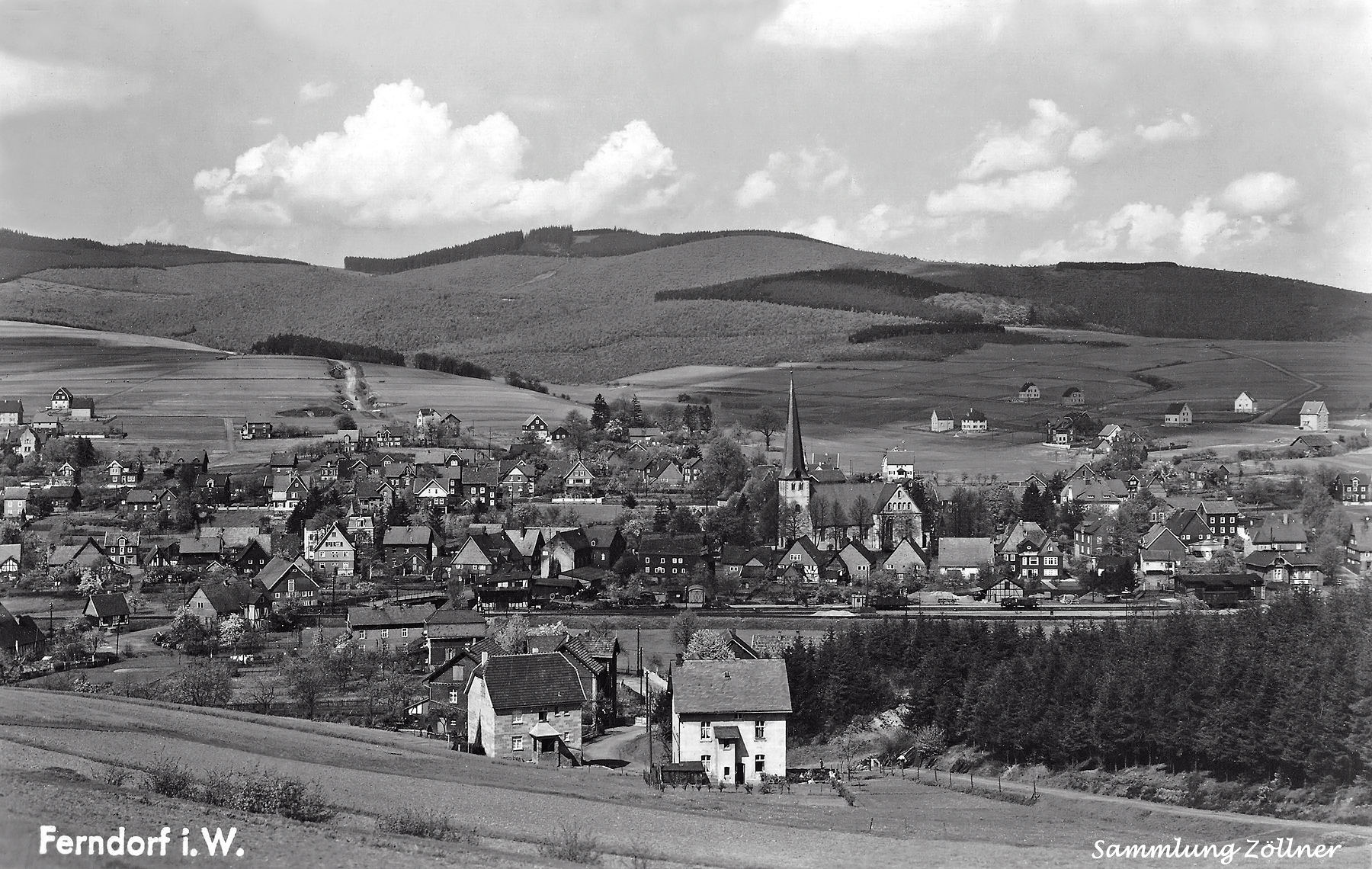 Diese Postkartenaufnahme zeigt den Ort Ferndorf mit der Laurentiuskirche und davorliegenden Bahnhofsanlagen mit drei Waggons im Ladegleis um 1933.
