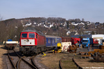 Im Straßenplanum am Mühlenweg in Erndtebrück lag der über eine Spitzkehre erreichbare Anschluss des Großrohrherstellers ESTA Rohr. Im September 1981 wurde er noch bedient, wie diese Aufnahme mit 212 162 zeigt, die gerade einen beladenen Rs-Wagen aus der Werkshalle über die Steilrampe gen Bahnhof hochwuchtet.