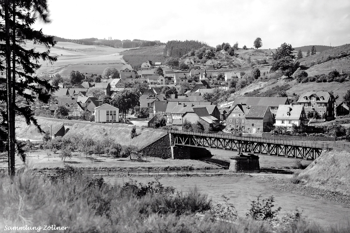 Vom Gersbachweg hatte man im Sommer 1967 diesen Blick auf Arfeld mit der Eisenbahnbrücke über die Eder im Vordergrund. Geradeaus in deren Verlängerung ist die evangelische Pfarrkirche des Ortes auszumachen.