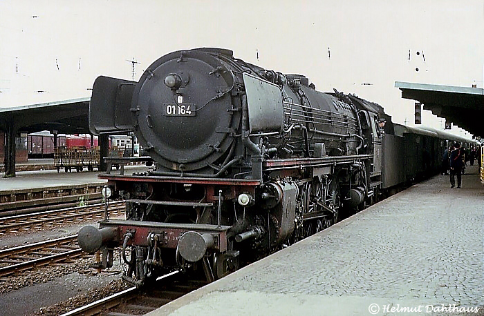 >> Zurück zu LokomotivenAm Samstag, dem 20. Juli 1968 trat Helmut Dahlhaus eine längere Bahnrundreise durch Deutschland an. Erste Station war Hamm, wo er in den Kopf machenden E 539 (Oberhausen---Kassel) umstieg. Von der neuen Zuglok, der Paderborner 01 164, wurde dieses Bild angefertigt.