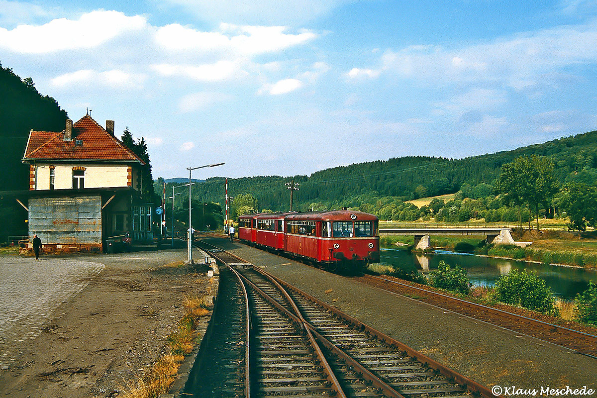 Km 63,774 Bahnhof Ederbringhausen [FEDN]Nebenbahnidylle mit Schienenbus an einem Juliabend 1986 im Bahnhof Ederbringhausen. Der nur sonntags auf diesem Abschnitt verkehrende Eto 6447 von Brilon Wald nach Marburg, angeführt von 798 565, kommt mit drei Minuten Verspätung um 18.45 Uhr direkt neben der Eder am Bahnsteig zum Halten. Seelenruhig marschiert der Zugführer zum Zugschluss um von dort den Fahrauftrag zu erteilen. Nach der Abfahrt kehrt im Bahnhof bis 20.55 Uhr wieder Ruhe ein, dann werden für den hier durchfahrenden E 8260 ein letztes Mal an diesem Tag die Schranken geschlossen. Aufnahme von Klaus Meschede.
