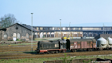 Nach Abzug der Bahnhofsköf der Baureihe 332 in Warburg, wurden die Güterkunden in Wrexen, Scherfede und Nörde eine Zeit lang von Kassel Rbf aus mit der BR 294 bedient. Am frühlingshaften 20. Mai 1997 stand Martin auf der Brücke Johann-Conrad-Schlaun-Straße in Nörde und lichtete die Bedienung des Anschluss Warburger Wellpappenfabrik mit 294 142 im Mittelformat ab.