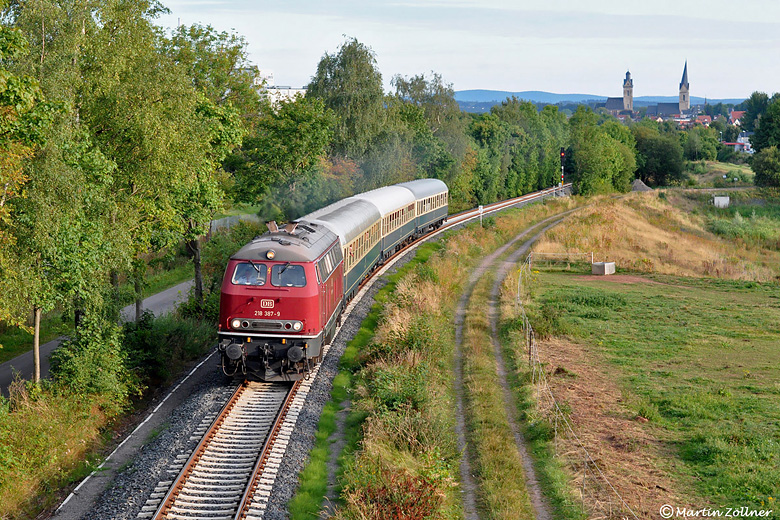 Noch ein wenig Sonne gab es zum Abschluss des Kurhessenbahnstreckenfestes am Abend des 02. September 2012. 218 387 machte sich mit drei D-Zugwagen als DPN 20996 von Korbach auf den Weg nach Brilon Stadt und lies so ein wenig die Erinnerung an den legendären Schnellzug 2328 von Bad Wildungen nach Amsterdam aufleben, der letzmalig am 01. Juni 1991 hier unter der Brücke der Bundesstrasse 251 an der Korbacher Ausfahrt hindurchfuhr.