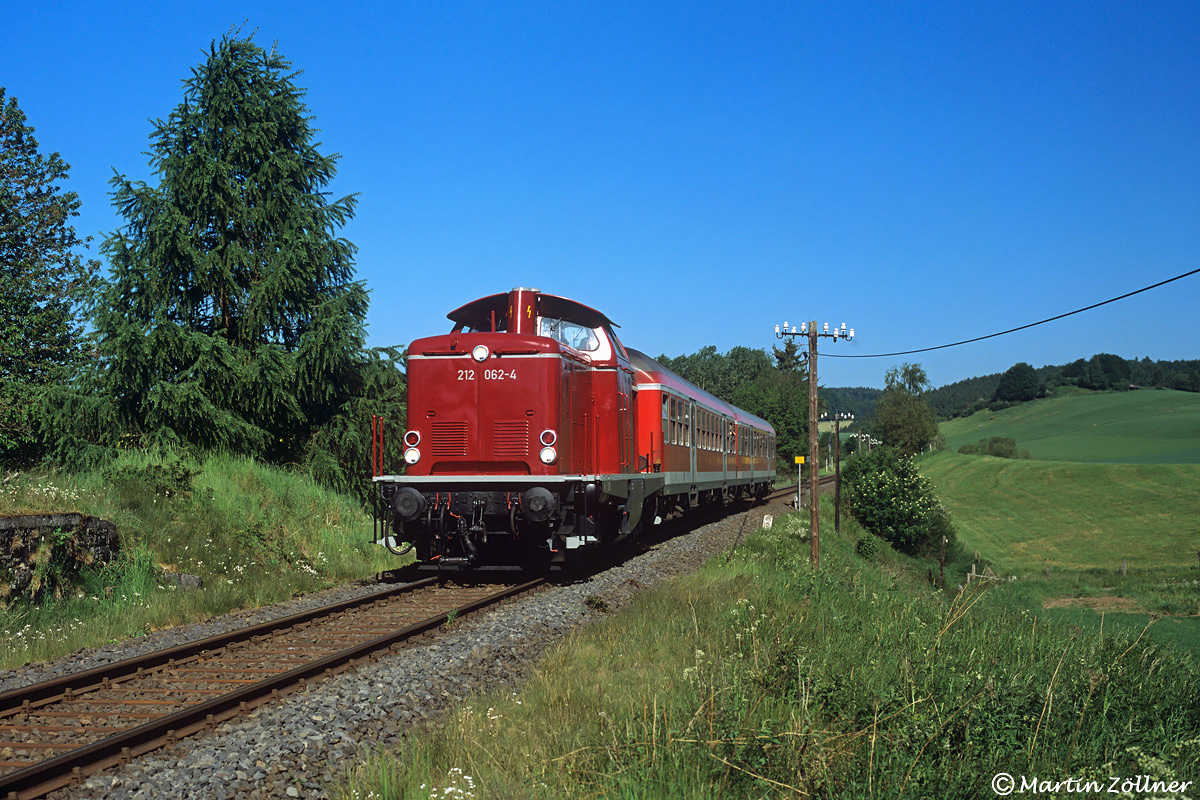 Die vom Verein "Freunde der 212 001-2 e.V." betreute, altrote 212 062 nahm ebenfalls beim am 28. Mai 2005 stattfindenden Streckenfest der Kurhessenbahn teil. Bei strahlend blauem Himmel bespannte sie die RB 33805 von Brilon Wald nach Korbach, hier aufgenommen bei Rhena-Lelbach.