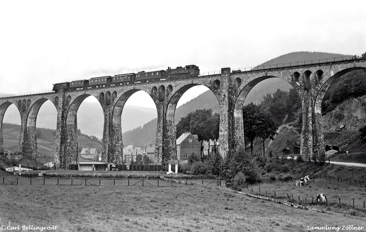 Km 61,5 Willinger Viadukt25. Juni 1939: schlechtes Wetter im Upland. Carl Bellingrodt hatte sich trotzdem mit seiner Plattenkamera in den Wiesen unterhalb des Willinger Viaduktes postiert. Vor die Linse kam ihm die Kasseler 93 097, welche rückwärts mit dem P 377 nach Bad Wildungen in Richtung Usseln dampfte. Auffallend die im Vergleich zu heute erst wenigen, vorhandenen Wohnhäuser im Ort.