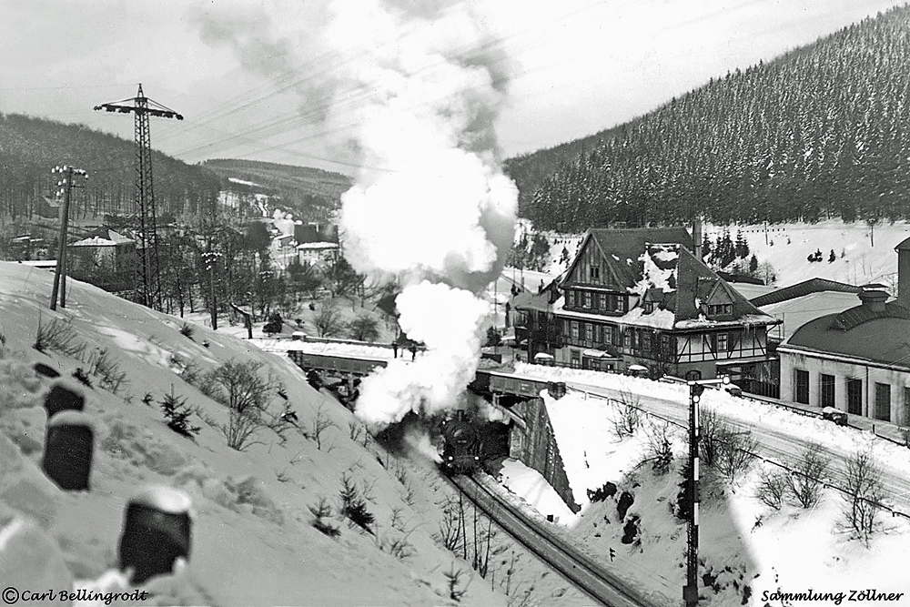 Km 69,0 Esig Brilon Wald (alter Standort)Am 10. Februar 1952 verlässt 93 976 (Bw Frankenberg) unter mächtiger Dampfentwicklung mit dem E 592 den Bahnhof Brilon Wald in Richtung Willingen. Zu dieser Zeit stand das Einfahrtsignal der Uplandbahn noch direkt vor der Brücke an der Bundesstraße 251 Korbacher Straße, welche damals noch aus Blechträgern bestand. Nach Einrichtung des Anschlussgleises zum Holzlagerplatz der Degussa wurde das Esig B dann um etwa 500 Meter nach km 68,523 verlegt.