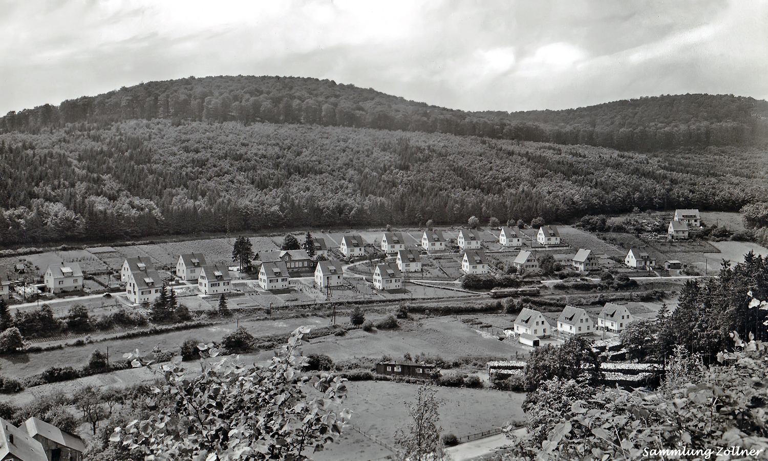 Vom Friedrich-Köster-Weg in Brilon Wald geht der Blick im Sommer 1956 herüber zur neuen Siedlung am Kirchweg mit seinen fast allen gleichen Häusern. Leider hat der Fotograf von Cramers Kunstanstalt nicht richtig aufgepasst und für das in Richtung Willingen fahrende VT 95-Gespann den falschen Auslösezeitpunkt gewählt.