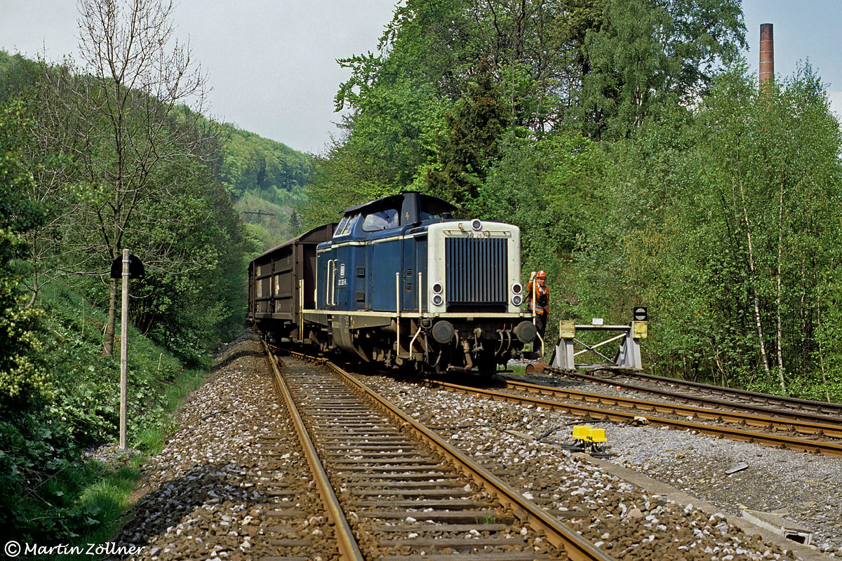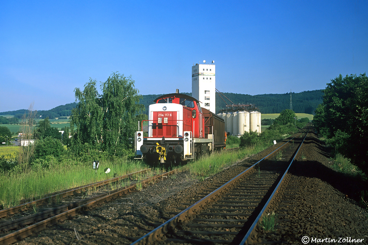 Auch Ende der neunziger Jahre wurde die Anschlussstelle Industriegleis in der Nähe von Korbach noch sporadisch bedient. Am wolkenlosen Morgen des 05. Juni 1997 hatte sich die weite Anreise auf Verdacht ins Upland doch gelohnt, als 294 113 mit einem Wagen als Sperrfahrt CB 66392 tatsächlich zur Fa. Raiffeisen unterwegs war und hier an der Anschlussweiche als Mittelformatdia bildlich gebannt werden konnte.