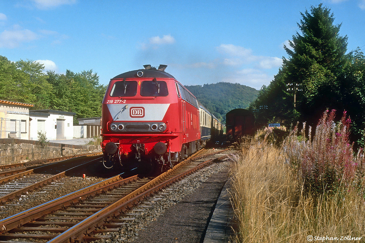 Im Herbst 1990 wurde die Braunschweiger 218 277 vom Bw Hagen 1 aus als Leihlok eingesetzt. Am Sonntag, den 16. September konnte sie auf der Uplandbahn angetroffen werden, hier mit dem D 2328 von Korbach nach Amsterdam bei der Ausfahrt in Willingen bei schönstem Sonnenwetter auf Diafilm verewigt.