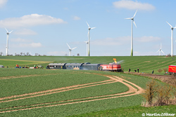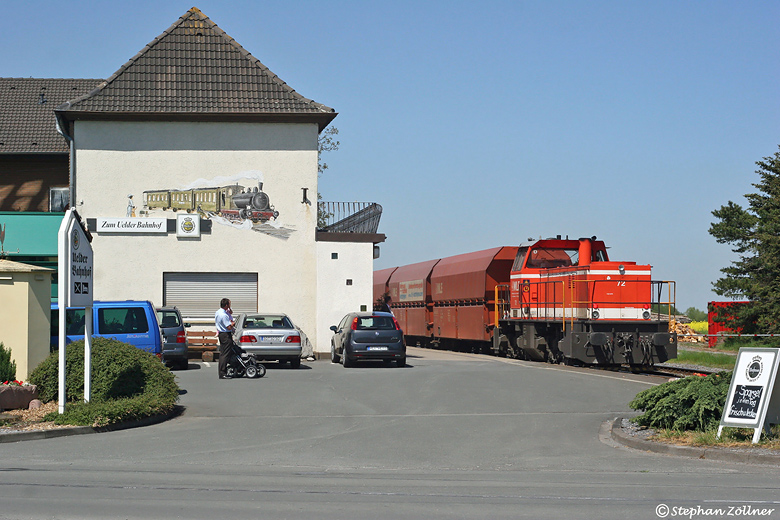 Der 10. Mai 2008 war ein sonniger Frühlingstag und im Gasthof "Zum Uelder Bahnhof" wurde zum Mittagstisch frischer Spargel gereicht. Vater und Sohn gönnten sich eine kleine Auszeit an der frischen Luft und beobachteten die Vorbeifahrt des beladenen Brühnezuges, hier mit Schlußlok WLE 72 bildlich festgehalten.