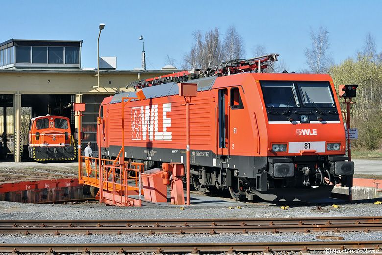 Die Gleise zum Bahnbetriebswerk der WLE sind nicht mit Fahrdraht überspannt. Wenn die E-Lok 81 in den Schuppen einrücken will, rollt sie vom Bahnsteig im DB-Bahnhof in Schwungfahrt abgebügelt bis auf die Drehscheibe und wird dann mit einer Kleinlok in die Halle gezogen. Am 19. März 2011 ist WLE 07 der kleine Helfer, der bei schönstem Sonnenschein von seinem Abstellplatz hinter dem Schuppenstand 7 zur Hilfe eilt.