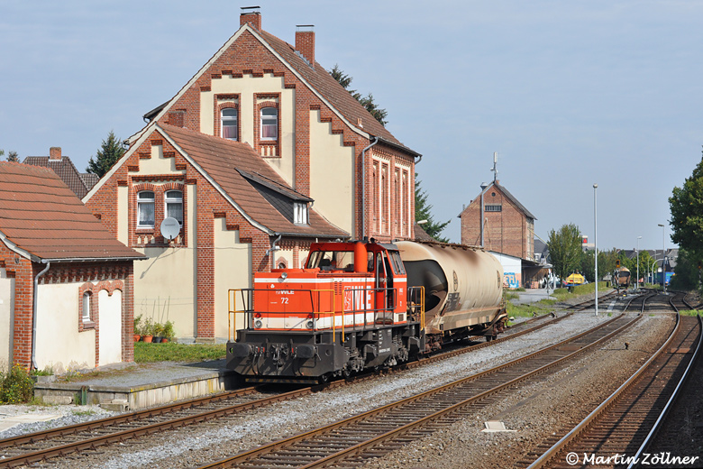 Mit nur "einer Kiepe" Braunkohlenstaub hat WLE 72 von Neubeckum kommend den Zielbahnhof Erwitte erreicht und wird sogleich auf das Industriestammgleis der Stadt Erwitte wechseln, um den Wagen beim Zementwerk Spenner zur Entladung bereitzustellen. In den 2000er Jahren wurde die Anlieferung des Brennmaterials nach und nach auf LKW-Anlieferung umgestellt.