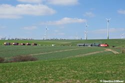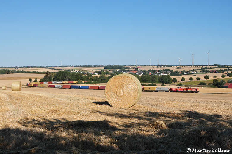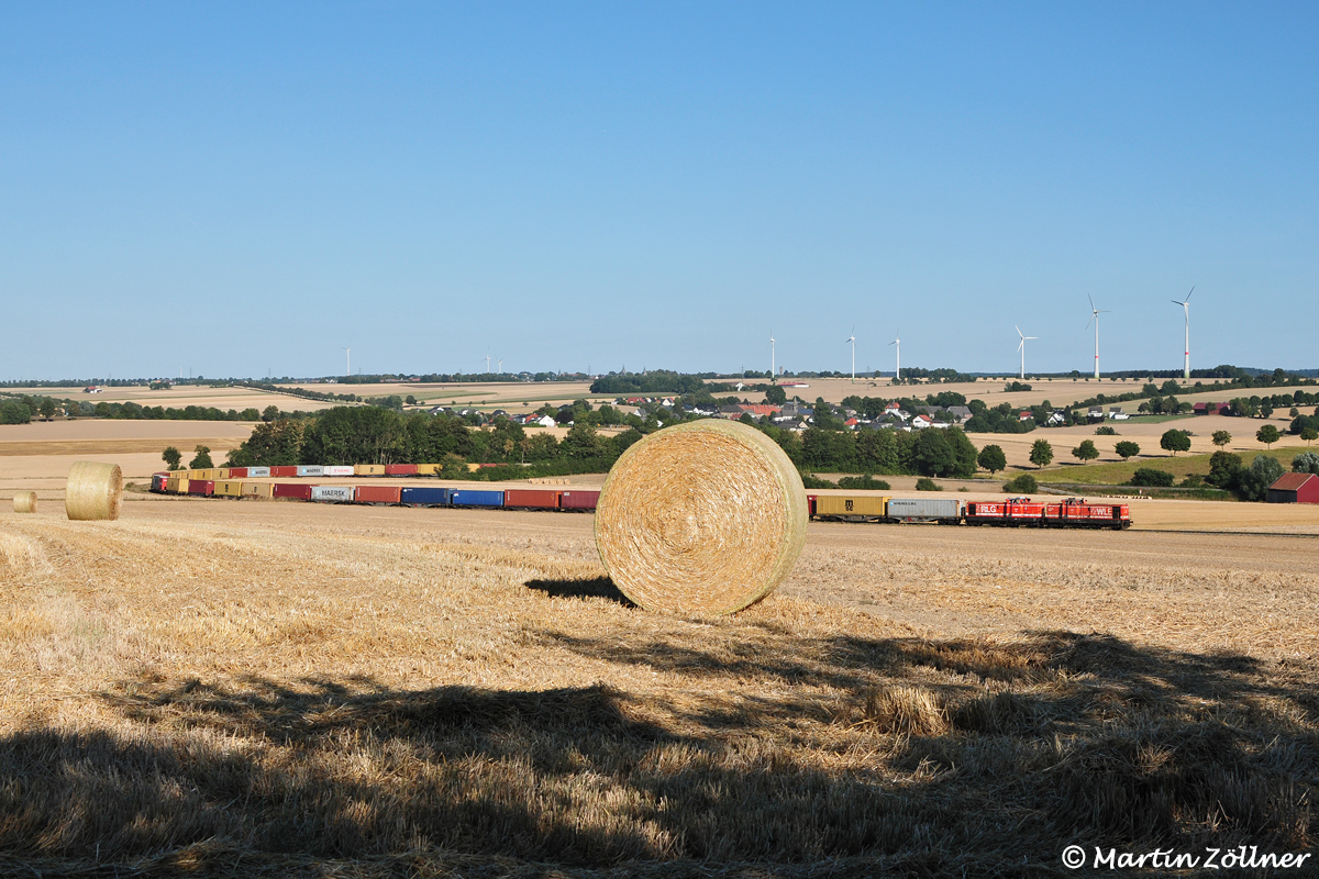 Der August 2018 galt als Jahrhundertsommer mit anhaltend heißem und sonnigem Wetter. Am Abend des 05. herrschen immer noch 35°C vor, als der Containerzug von der Warsteiner Brauerei zum Umschlag nach Hamburg KV Eurokombi zu befördern ist. Als Besonderheit mit dem aus WLE 36 und RLG 68 gebildeten Deutz-Doppel bespannt, konnte der aus 20 Doppeltragwagen gebildete Zug auch im Steigungsabschnitt nahe des Effelner Weges aus dem Schatten heraus mit ein paar Motiv-Strohballen abgelichtet werden.