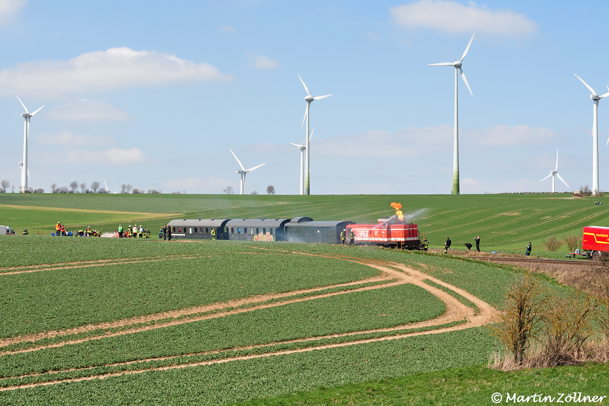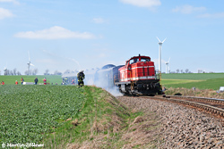 Der Lokbrand wurde mit einem propangasbetriebenem Gerät simuliert, auch Rauch wurde erzeugt. Näher als bei diesen drei Aufnahmen kam man als Passant natürlich nicht heran, um die Übung nicht zu stören. Der nachfolgende Containerzug war früh dran und musste derweil in Uelde die Streckenfreigabe abwarten.