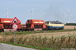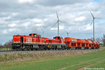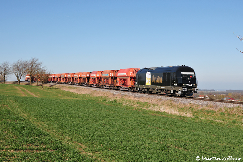Schöner Rücken kann auch entzücken: Am 17. März 2025 hat WLE 72 einen leeren Samms-Wagen bei Siepmann im Belecker Güterbahnhof abgeholt und wird zur Rückführung zur Lippstädter Lokhalle am Zugschluß des Mittagssteinzuges nach Beckum mitgeführt. In der Steigung zwischen Erwitte Nord und dem Lippstädter Ortseingang leistet sie der Zuglok WLE 36 ein wenig Schubunterstützung.