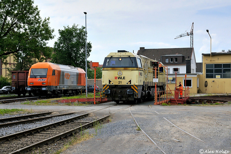 In der WLE-Hauptwerkstatt in Lippstadt Nord werden auch Auftragsarbeiten an fremden Triebfahrzeugen vorgenommen. RTS 2016 907 hatte am Mittag des 18.07.2020 die Hallen an der Beckumer Straße bereits fertiggestellt verlassen und wurde zwecks Abholung zur Lokhalle an die Stirper Straße überführt. Nebenan fuhr WLE 21 gerade eine Runde Karussell, um aufs Ausfahrgleis bugsiert zu werden.