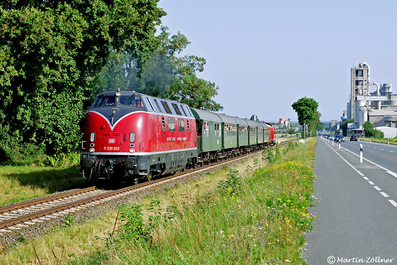 Km 9,55 SöbberinghofDie Eisenbahnfreunde Warstein hatten zur Feier ihres 40jährigen Bestehens am 01. September 2024 großes Glück mit dem Wetter. Zu den geplanten Sonderfahrten mit dem Hammer Museumszug rund um Warstein schien permanent die Sonne, wie bereits am Vormittag, als die MEH V 200 033 den Zubringerzug von Lippstadt am Söbberinghof an den Erwitter Zementwerken gen Anröchte fahrend röhrend anführte.