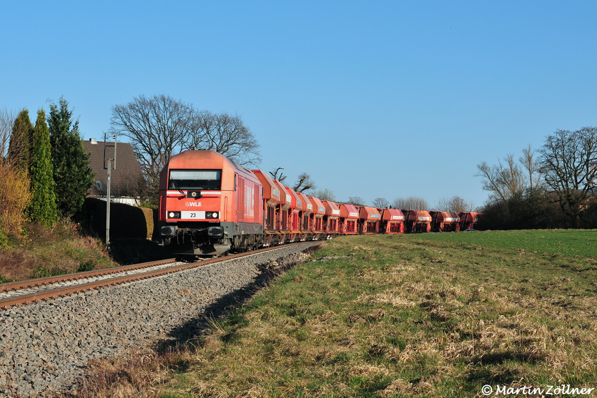 Km 24,7 Belecke, DrewerwegMit einem Steinleerzug von Beckum rollt WLE-Eurorunner 23 am 19. März 2025 kurz vor dem BÜ Drewerweg nahe des 1960 aufgegebenen Steinbruchs Drewer die stärkste Neigung des Westfälischen Semmerings herunter auf Belecke zu und konnte dort in schöner Nachmittagssonne bildlich verewigt werden.