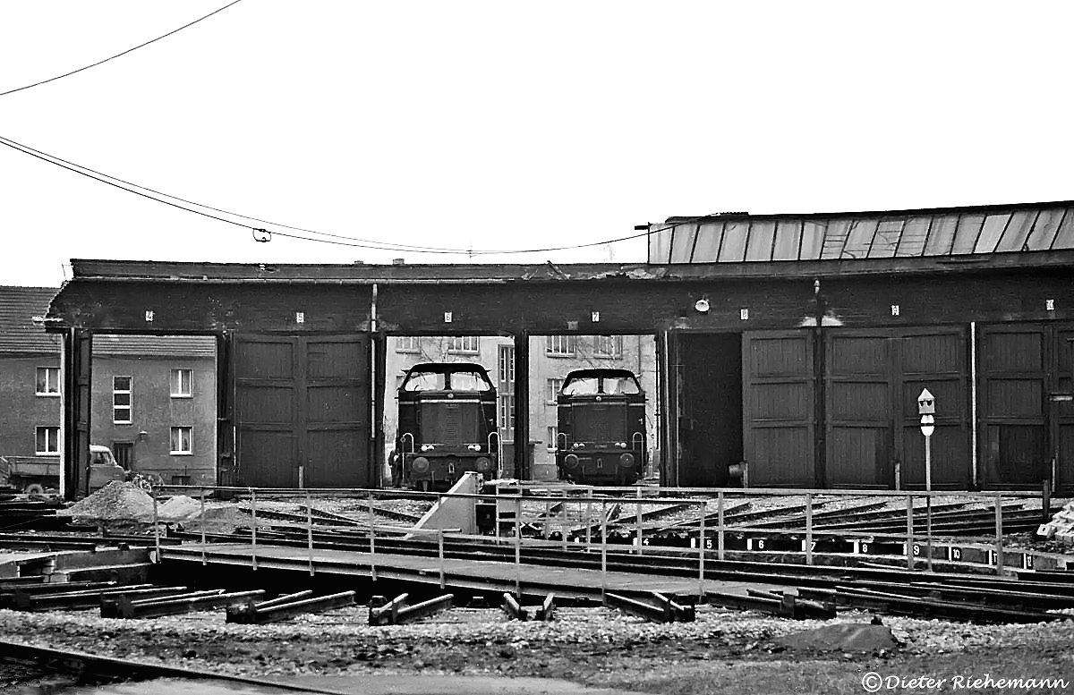 Wegen Neubau mit Verbreiterung der Stirper Straße samt Unterführung unter der DB-Strecke 1760 hindurch kam es Anfang 1973 zum Teilabbruch des WLE-Lokschuppens. Am 11. Januar standen die Loks VL 0643 (links) und VL 0642 (rechts) in den Trümmern des linken Hallenteils, als Dieter Riehemann den Auslöser seiner Kamera betätigte.