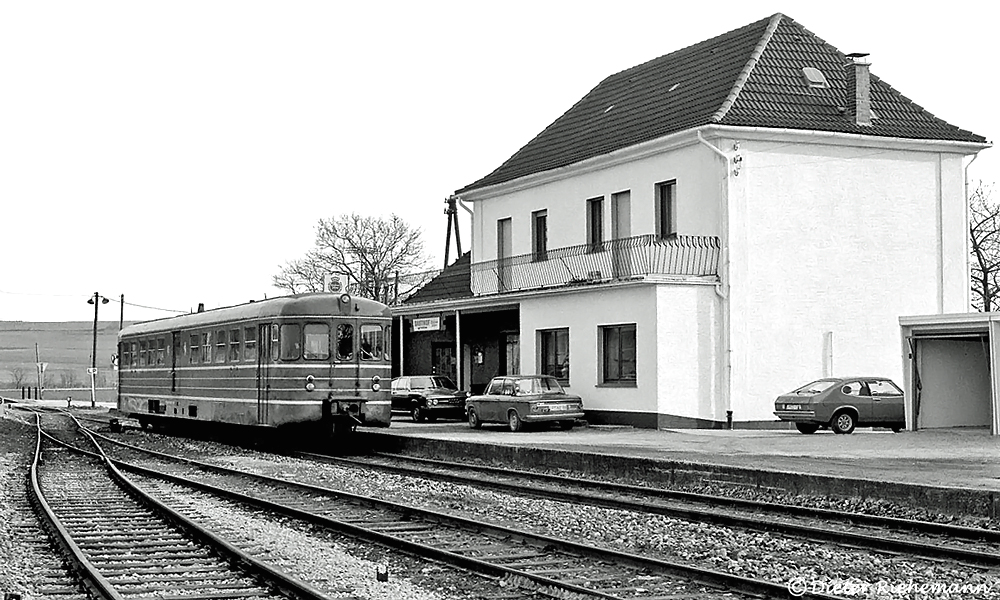 Die Uerdinger-Triebwagenabschiedsfahrt vom 22. März 1975 auf der WLE machte auch im Bahnhof Uelde Station. Dieter Riehemann lichtete am Nachmittag den VT 1032 als Nt 1120 Brilon Stadt – Neubeckum neben ein paar zeitgenössischen Pkw vor dem Empfangsbebäude ab.