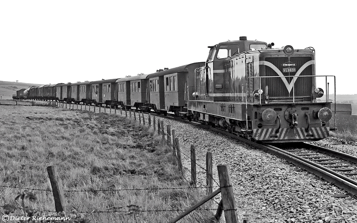 Am 27. September 1975 hatte WLE VL 0631 die Aufgabe, die Reisezugwagengarnitur des letzten planmäßigen Personenzuges Lippstadt – Warstein mit dem samstäglichen Nachmittagsgüterzug nach Lippstadt zurückzubringen. Es durfte sogar mitgefahren werden. Die Aufnahme von Dieter Riehemann zeigt den Zug am Belecker BÜ Effelner Weg.
