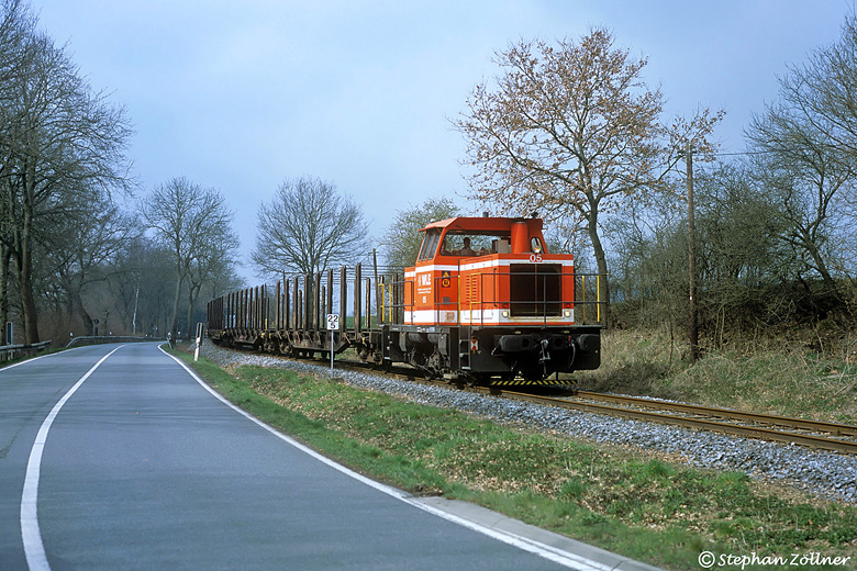 Weit und breit kein Auto zu sehen auf der Bundesstraße 516 am Bahnübergang in Drewerheide am Mittag des 05. April 2007. Da konnte man ruhig mal sein Fahrzeug alleine vor der Lichtzeichenanlage stehenlassen und die Rüttelplatte WLE 05 mit der Übergabe nach Rüthen bei der Vorbeifahrt mit dem Fotoapparat aufs Korn nehmen.