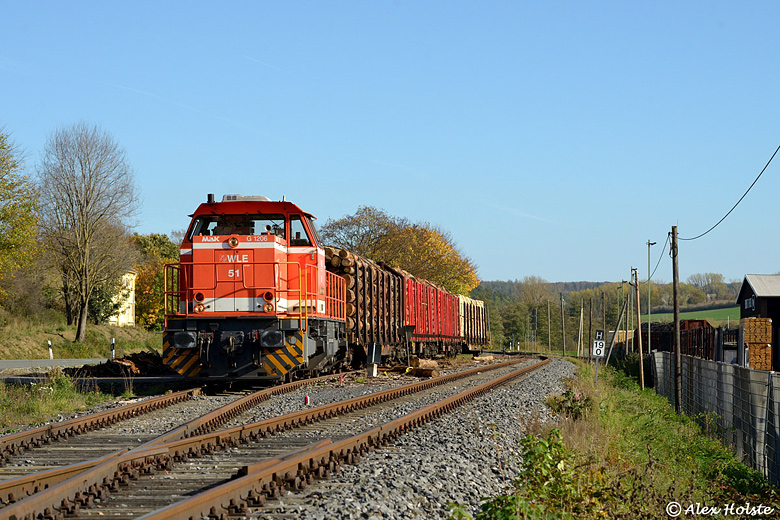 Bei dem wunderbaren Herbstwetter des 26. Oktober 2022 war auch Alex Holste mit der Kamera im Möhnetal unterwegs. Im Bahnhof Altenrüthen konnte er nach der Bedienung des Anschluss Fisch noch das Umsetzen der Zuglok WLE Lok 51 für die Übergabefahrt nach Warstein von der Westseite aus bildlich einfangen.