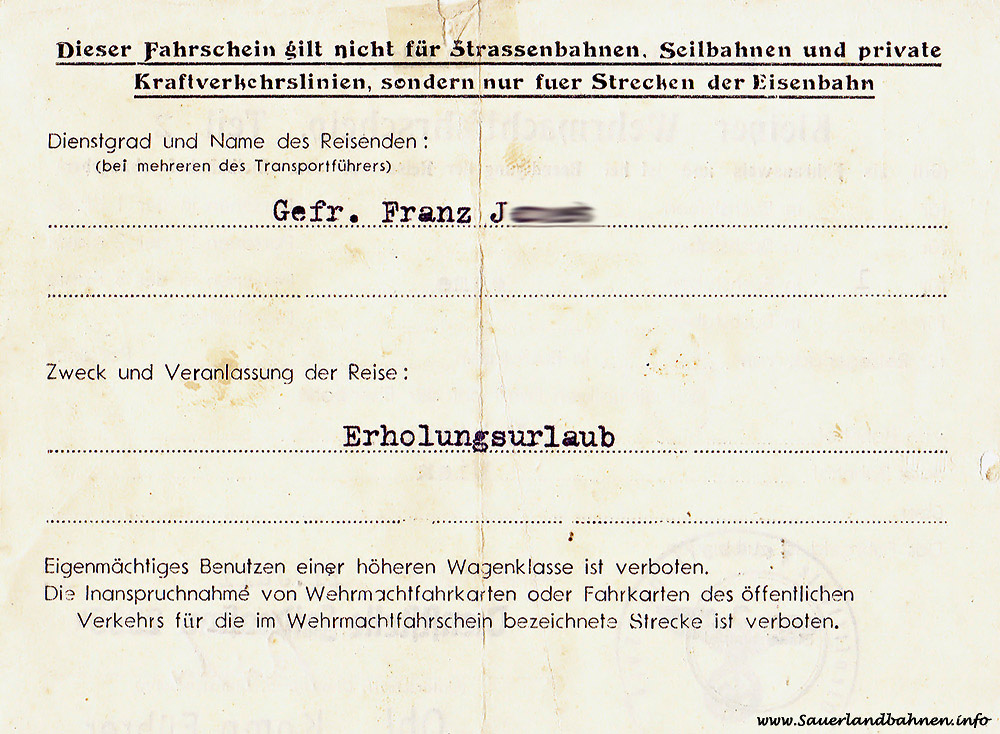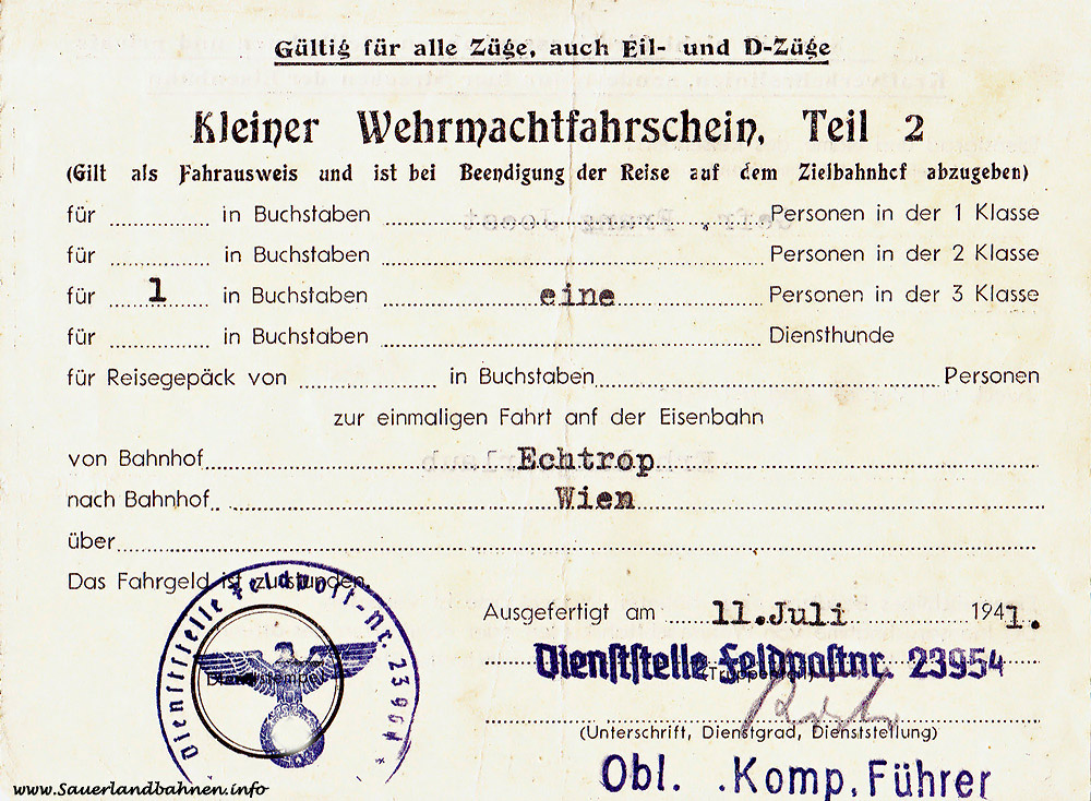 Für die Soldaten der Wehrmacht wurden im 2. Weltkrieg durch die Dienststellen unentgeltliche Zugfahrscheine für Familienheimfahrten zum Urlaub ausgegeben. So kam es teilweise zu recht ungewöhnlichen Reiseverbindungen, wie bei diesem, am 11.07.1941 ausgestellten, kleinen Wehrmachtsfahrschein für die Rückfahrt aus dem Erholungsurlaub des Gefreiten Franz J. zur Truppe in der Relation Bahnhof Echtrop WLE nach Wien.