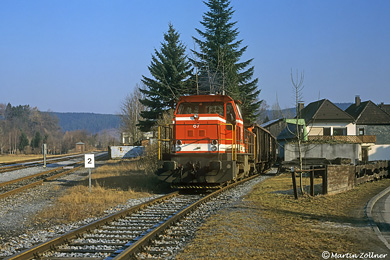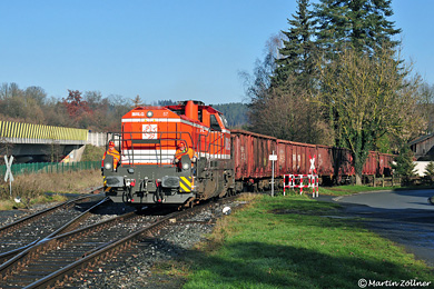 Km 11,6 Stemel, Schmacke & KumpmannAm 13. November 2019 kam nach fünf Jahren Stillstand erstmals wieder ein Güterzug auf der Röhrtalbahn bis zum Bahnhof Sundern. Die neue RLG Lok 57 brachte sechs Snps-Wagen zur Verladung von Borkenkäferholz in den Endpunkt, hier bei der Vorbeifahrt an den ehemaligen Werkhallen des Präzisions-Stahlrohrherstellers Schmacke & Kumpmann in Stemel, dessen Schriftzug immer noch lesbar am Mauerwerk prangt.