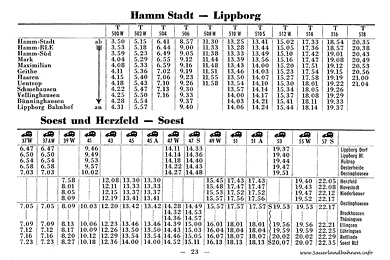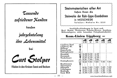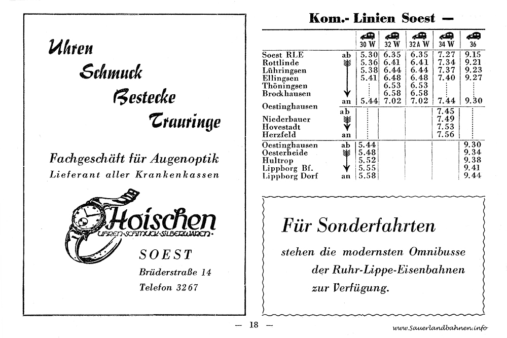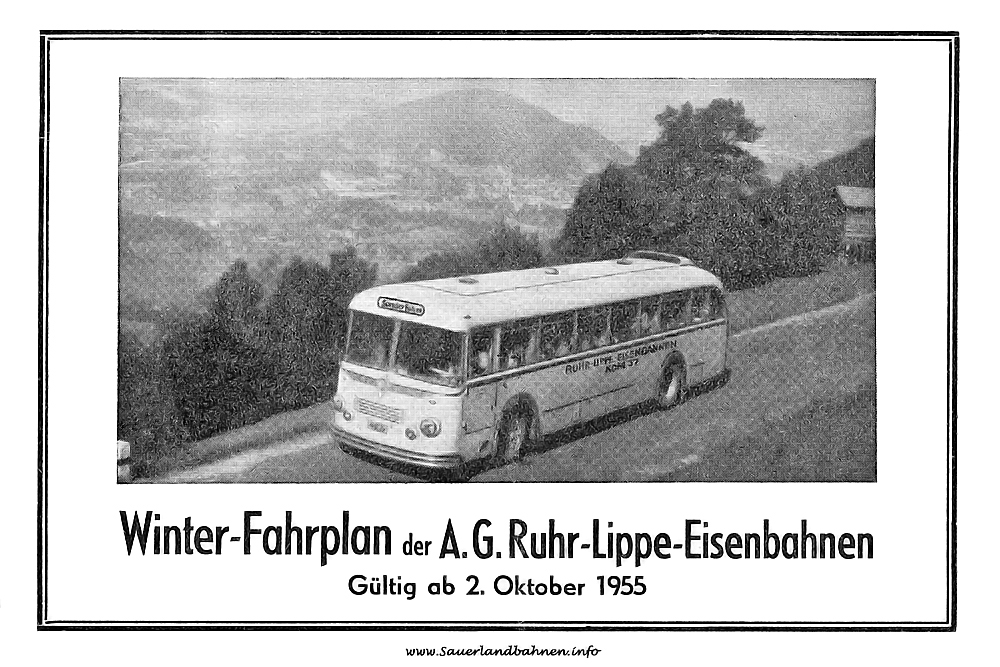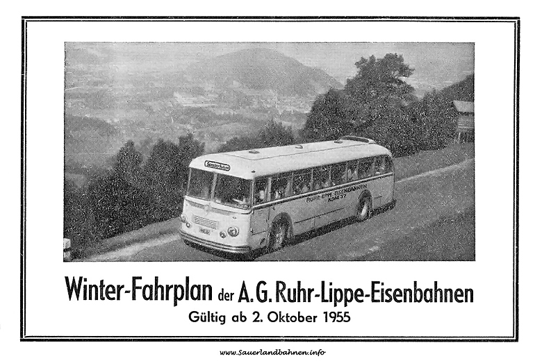 Für ihr eigenes Netz erstellten die A.G. Ruhr-Lippe-Eisenbahnen in den fünfziger Jahren immer ein kleines Fahrplanheft, in dem alle Bus- und Zugfahrten verzeichnet, sowie zeitgenössische Werbung plaziert war. Für den Winterfahrplan 1955 ⁄ 56 zeigen wir hier als Auszug das Angebot der hier behandelten Linie.