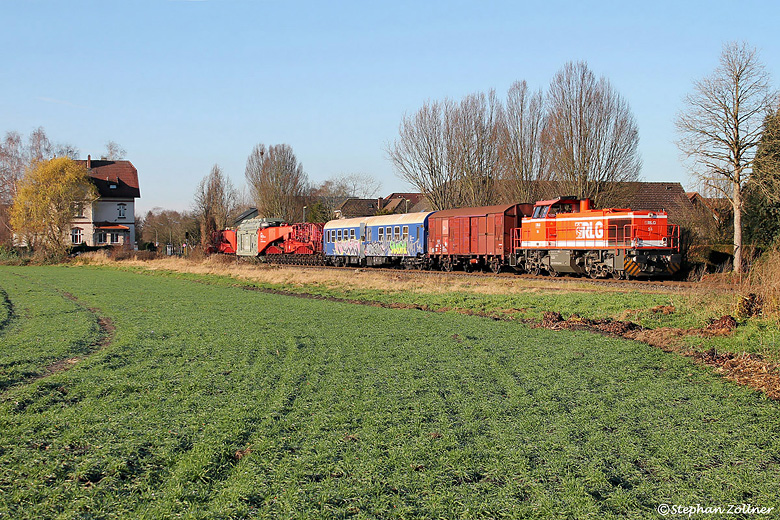 Km 7,4 Bahnhof Maximilian [EMAL]Am 08. Dezember 2015 konnte Stephan Zöllner bei Tageslicht einen Großtrafotransport mit dem 32-achsigen Tragschnabelwagen Uaai 839 bei der Durchfahrt durch den Bahnhof Maximilian auf dem Weg zum Umspannwerk am Kraftwerk Westfalen beobachten. Die damalige Ortslok RLG 54 stellte die Traktion sicher.