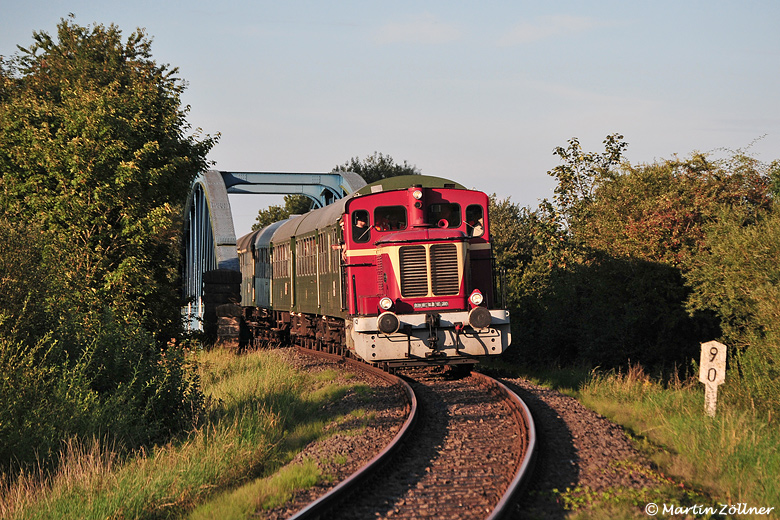 Am 27. August 2017 fand die jährlich wiederkehrende Kirmes in Lippborg statt. Am späten Nachmittag haben sich alle Quellwolken aufgelöst. So konnte Martin Zöllner in schönstem Büchsenlicht den Sonderzug der Museumseisenbahn Hamm beim Verlassen der DHK-Brücke bildlich dokumentieren. Die bei der MEH untergekommene RLE 52 war hier bereits früher für ihren Voreigner als Reservelok unterwegs.