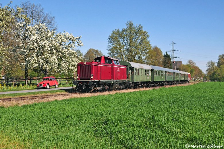 Nach erfolgreichem Ostereiersuchen ist der Sonderzug der Hammer Museumseisenbahn am späten Nachmittag des 18. April 2022 auf dem Rückweg von Lippborg nach Hamm RLG. Kurz vor der Infrasturkturgrenze zwischen MEH und RLG rollt 212 079 aus der Haltstelle Ramesohl (einst Vellinghausen). Einer der etwa 15 Fotografen stellte sein Vehikel als stilgerechte Motivbereicherung zur Verfügung.
