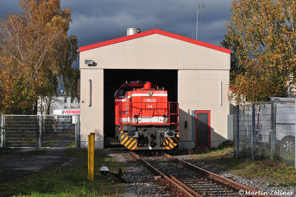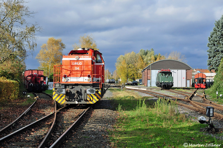 Km 0,5 Bahnhof Hamm RLE ⁄ RLG [EHMR]Volles Haus in Hamm RLG am 10. November 2023: Während RLG 54 nach der Zugleistung 51 mit den leeren Wagen vom DuPont-Werk soeben als Rangierfahrt aus dem Hammer Rbf zurückgekehrt ist und nun in den im Bildhintergrund neben der Altölumladestelle gelegenen, 1993 neu gebauten Lokschuppen einrückt, halten die drei umgebenden Loks der MEH bereits Wochenendruhe.