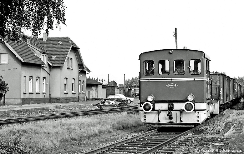 Vor ihrem damaligen Heimatdomizil präsentierte sich RLE D 57 am 27. Juli 1974. Dieter Riehemann hatte seine Kamera griffbereit und lichtete die Deutzstangenlok in schwarz ⁄ weiß für die Nachwelt ab.