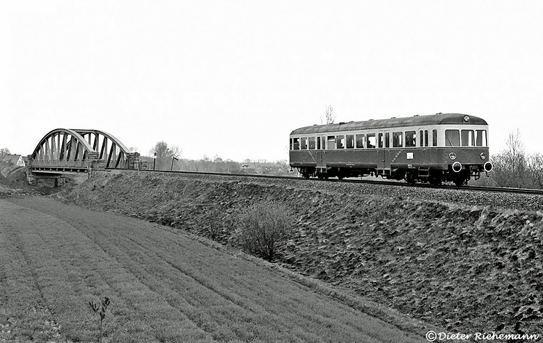 Die Brücke über den Datteln-Hamm-Kanal bei Geithe war und ist ein beliebter Fotostandpunkt. Am 24. April 1976 stand dort auch Dieter Riehmann und nahm den auf Sonderfahrt befindlichen VT 65 der TWE mit seiner Kamera auf.