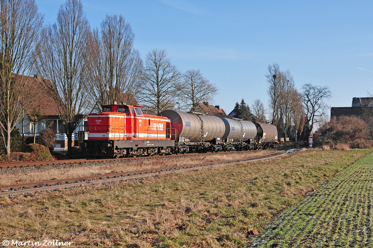 Mit zwei Wagenladungen Ammoniak für die moderne Rauchgasentschwefelungsanlage des Kohlekraftwerks Westfalen am Zughaken erreicht die Deutzlok RVM 28" die Betriebsstelle Schmehausen. Am 26. Januar 2017 enstand diese Aufnahme beim Überqueren des BÜ Siegenbeckstraße.