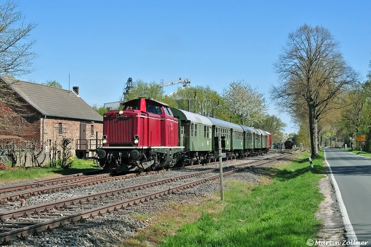 Am Ostermontag, den 18. April 2022 führte die Museumseisenbahn Hamm mit der 212 079 auf ihrer Strecke nach Lippborg eine Ostereiersuchfahrt durch. Am Nachmittag gegen 16.00 Uhr steht der Zug zur Rückfahrt nach Hamm RLG am Bahnsteig im Endbahnhof bereit, als Martin den Verschluss seiner Kamera auslöst.