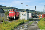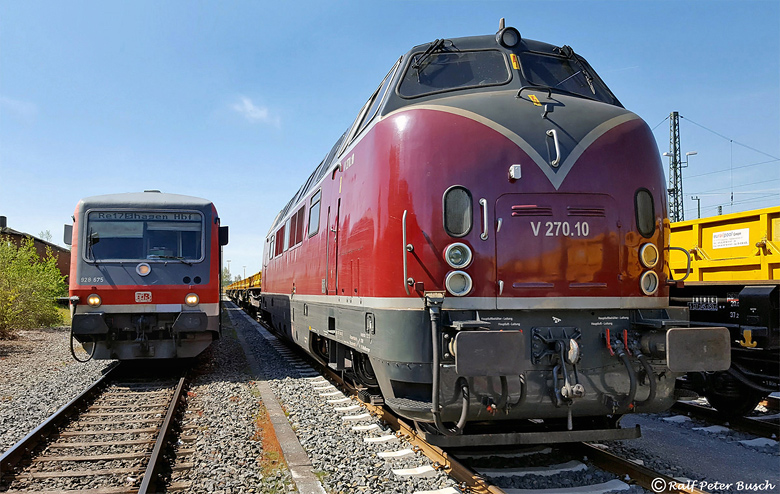 Im Sommer 2006 kamen auf der Linie RE 17 im Oberen Ruhrtal noch 628 zum Einsatz. An der Warburger Tankanlage konnte Ralf Peter Busch am 06. Mai neben seinem Traktionsgerät die mustergültig aufgearbeitete V 270.10 (ex DB 221 124) der Schienen-Güter-Logistik SGL mit abgestelltem Bauzug aufnehmen.