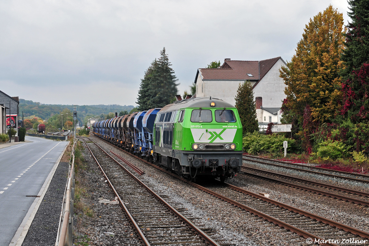 Am Tag der deutschen Einheit 2019 hat 225 073 von AIX Rail die Aufgabe, der Gleisbaustelle zwischen Nuttlar und Olsberg eine Schotterwagengarnitur von Recklinghausen Süd aus zuzuführen. Bei Hüsten ist dann auch die höchste Fahrstufe eingelegt, als bei minimaler "Sparsonne" dieses Bild angefertigt wurde: