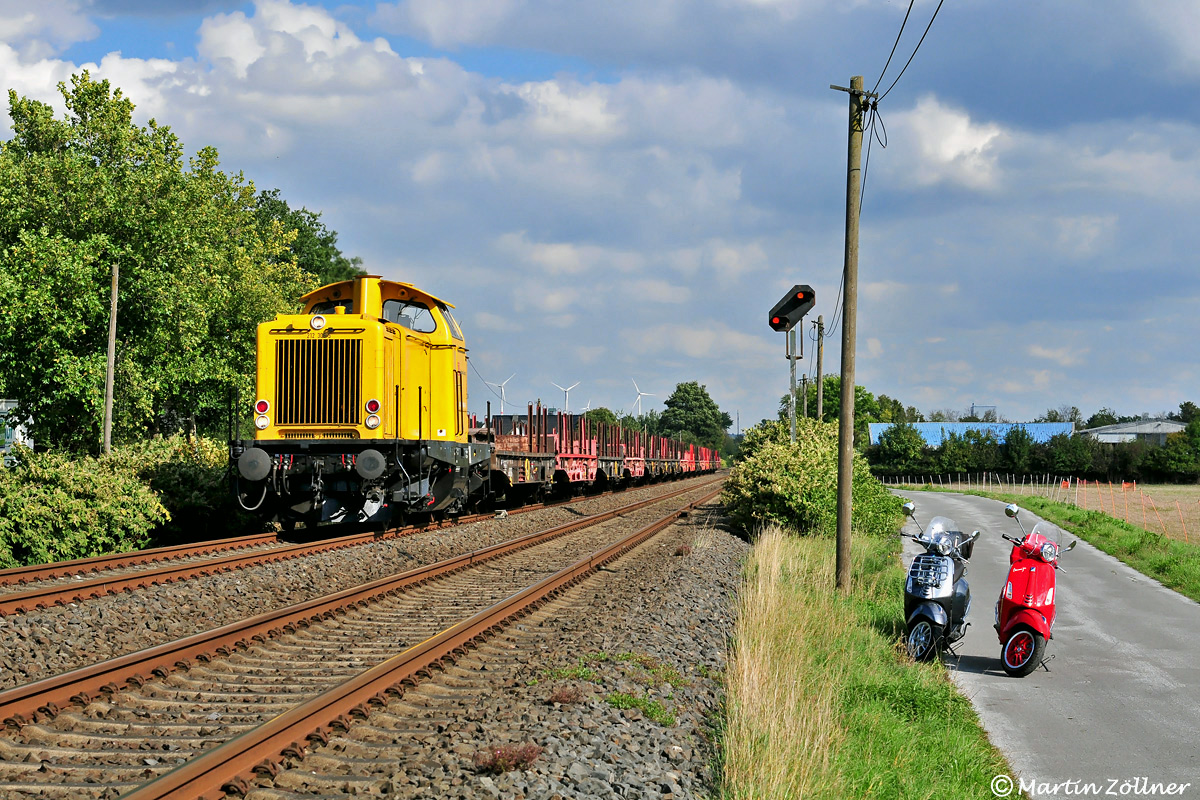 Für den Nachmittag des 30. September 2022 war die Abfuhr eines leeren Langschienenzuges aus der Baustelle Marsberg – Scherfede von Bestwig nach Hagen Gbf angekündigt. So wurden kurzerhand die beiden Hobbys kombiniert und ein Boxenstopp am Evsig Wickede eingelegt. Erst zwei Minuten vor der Durchfahrt zeigte sich auch der Himmel von seiner besten Seite und spendierte Sonnenschein. Die Traktion oblag der ehemaligen Hagener 212 306, die heuer für DB Bahnbau aktiv ist.
