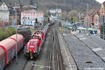 Am 21.10.2011 hat das Doppel aus 225 020 und 225 027 mit dem Brammenzug zum Hoesch-Walzwerk seinen Zielbahnhof fast erreicht, als von der Brücke der Bundesstraße 7 diese Herbstaufnahme angefertigt wurde.