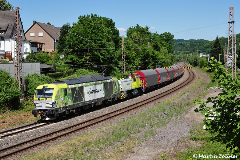 Elegant legt sich das Doppel der Dortmunder Eisenbahn (zur Captrain-Gruppe gehörend) mit dem Schützzug im ehemaligen Bahnhof Nachrodt in die Kurve. Je nach Zuglast wird der Stammlok 248 034 noch eine zweite Lok für die Rothaarrampe in Benolpe mitgegeben, am 19. Mai 2025 war dies die "kleine" DE 821 aka 273 004.