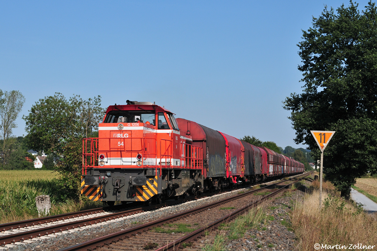 Die Zuführung der in Hüsten West be- oder entladenen Planencoilwagen nach Hagen-Vorhalle erfolgte immer nachmittags durch die RLG. Freitags wurde ein kombinierter Zug aus Coil- und leeren Kohlezugwagen von Neheim bis Schwerte vereinigt gefahren, wie hier am 23. August 2019 mit Zuglok RLG 54 bei Altendorf beobachtet: