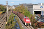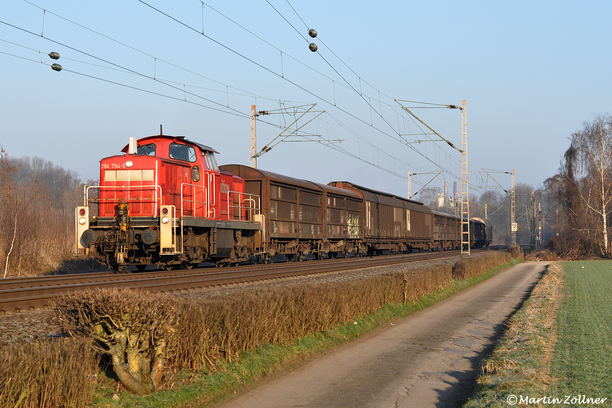 Nachdem sich der Frühnebel am 22. Februar 2011 rasch aufgelöst hatte, konnte die Übergabe von Schwerte nach Letmathe vor Hohenlimburg bildlich verewigt werden. 294 794 strebt mit der hauptsächlich aus mit Drahtrollen beladenen Schiebwandwagen bestehenden Fuhre auf den Zielbahnhof Letmathe zu, während im Bildhintergrund das ehemalige Kalkwerk Hagen-Herbeck auszumachen ist.